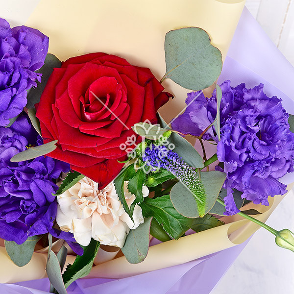 Роза красная – 1 шт., эустома фиолетовая-1 шт., гвоздика кремовая – 1 шт., декоративная зелень (вероника, эвкалипт), упаковка, лента.