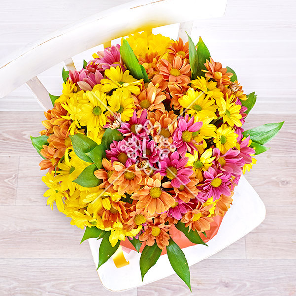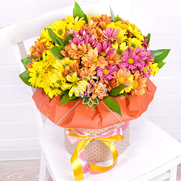 Кустовые ромашковидные хризантемы насыщенно-желтого, нежно-розового и оранжевого оттенков с зеленью рускуса, выглядят обворожительно!